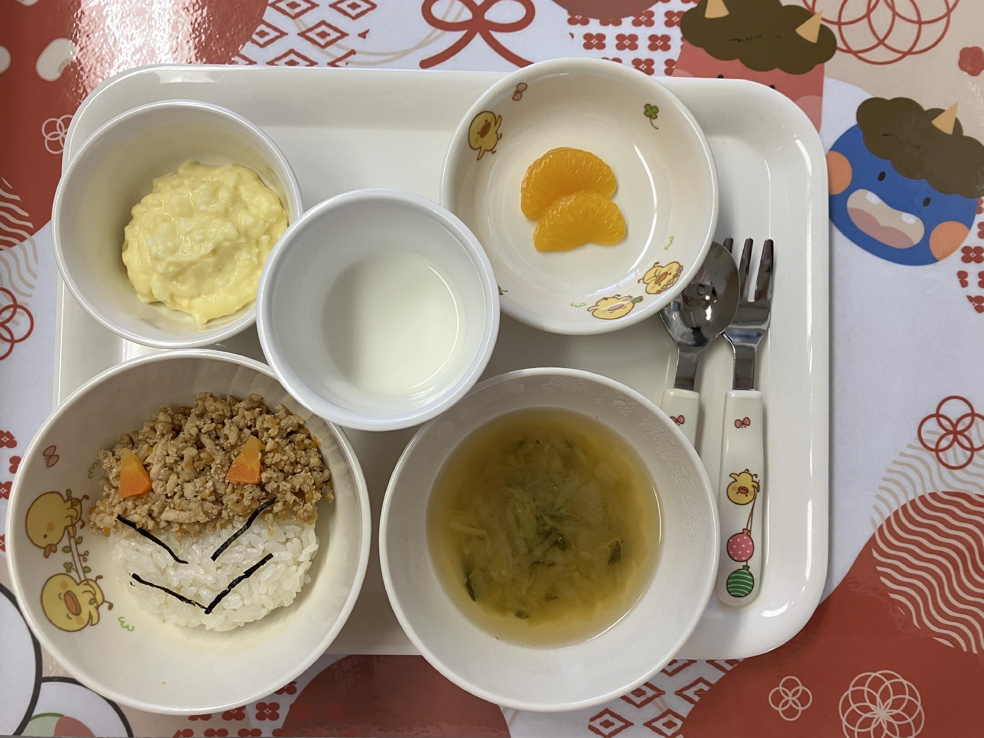 それに合わせて給食も鬼の顔に見立てたそぼろ丼です。鬼は外福は内〜!