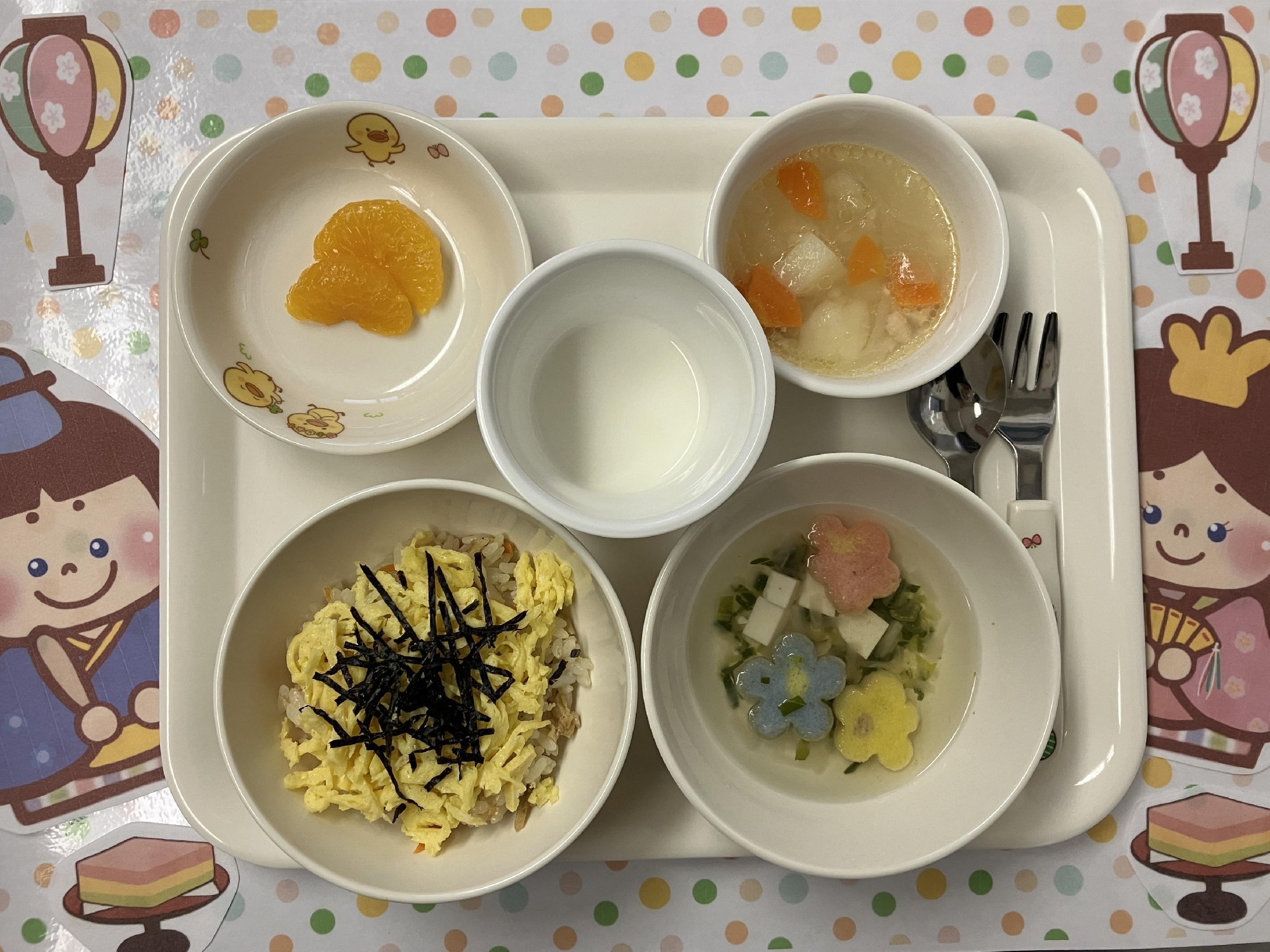 今日はひな祭りです🎎すまし汁の中にカラフルなお花のかたちのお麩が入っていて、子どもたちが笑顔になりました🌸いただきます。